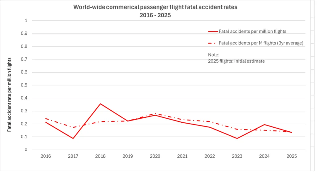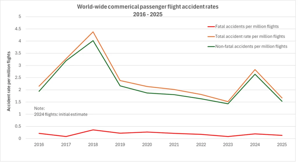 The total number of accidents in 2025 is lower than average and the fatal accident rate remains very low – the rate of fatal accidents per million flights has been below 0.4 since 2012.